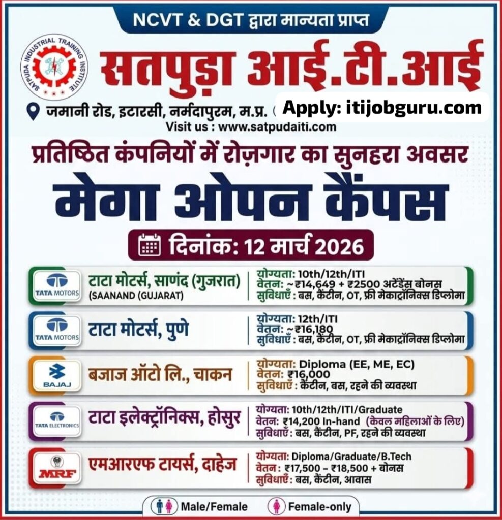 यह रोजगार मेला 12 मार्च 2026 को सुबह 9:00 से आयोजित की जाएगी इसके लिए आप सतपुड़ा प्राइवेट आईटीआई जमाने रोड इटारसी नर्मदा पुरम मध्य प्रदेश में आप अपने समस्त दस्तावेज लेकर इंटरव्यू में भाग लेने के लिए जा सकते हैं।