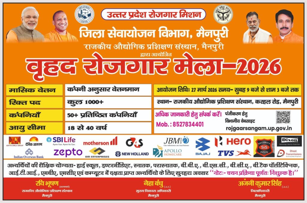 उत्तर प्रदेश रोजगार मिशन, जिला रोजगार कार्यालय मैनपुरी के सहयोग से, मेगा रोजगार मेला 2026 आयोजित करने जा रहा है। यह कार्यक्रम 27 मार्च 2026 को राजकीय औद्योगिक प्रशिक्षण संस्थान (आईटीआई), मैनपुरी में सुबह 9:00 बजे से दोपहर 3:00 बजे तक आयोजित होगा। यह रोजगार मेला नौकरी की तलाश कर रहे युवाओं के लिए एक शानदार अवसर है, जिसमें 1000 से अधिक पद उपलब्ध हैं और 50 से ज्यादा प्रतिष्ठित कंपनियां भाग ले रही हैं। वेतन कंपनी के नियमों के अनुसार दिया जाएगा तथा 18 से 40 वर्ष आयु के उम्मीदवार इसमें आवेदन कर सकते हैं। इस मेले में एसबीआई लाइफ इंश्योरेंस, मदरसन ग्रुप, जेबीएम ग्रुप, हीरो मोटोकॉर्प, बजाज ऑटो, टीवीएस मोटर कंपनी, डिक्सन टेक्नोलॉजीज, अपोलो होमकेयर, न्यू हॉलैंड एग्रीकल्चर, एसआईएस सिक्योरिटी सहित कई प्रमुख कंपनियां शामिल होंगी। हाई स्कूल, इंटरमीडिएट, स्नातक, स्नातकोत्तर, बीबीए, बीएससी, बीसीए, बी.टेक, पॉलिटेक्निक, आईटीआई, एमबीए, एमसीए तथा कंप्यूटर ज्ञान रखने वाले अभ्यर्थी इस मेले में भाग ले सकते हैं। इच्छुक उम्मीदवार पंजीकरण के लिए आधिकारिक वेबसाइट rojgaarsangam.up.gov.in पर जा सकते हैं। इस भर्ती प्रक्रिया में भाग लेना पूरी तरह निशुल्क है।
